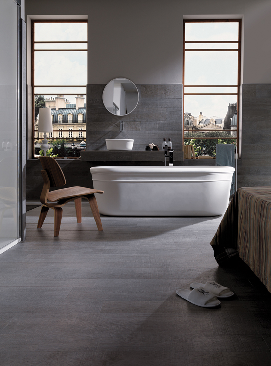 Kaliteli bir ahşap yer döşemesinin sıcaklığı porselen karoların dayanıklığı ile birleşiyor.